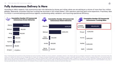 SHANGHAI, Feb. 5, 2026 /PRNewswire/ — Inceptio Technology (“Inceptio” or the “Company”), an industry leading developer of autonomous truck technologies, today announced it was recognized in ARK Invest’s Big Ideas 2026 report, affirming its position as the undisputed leader in real-world autonomous trucking kilometers.