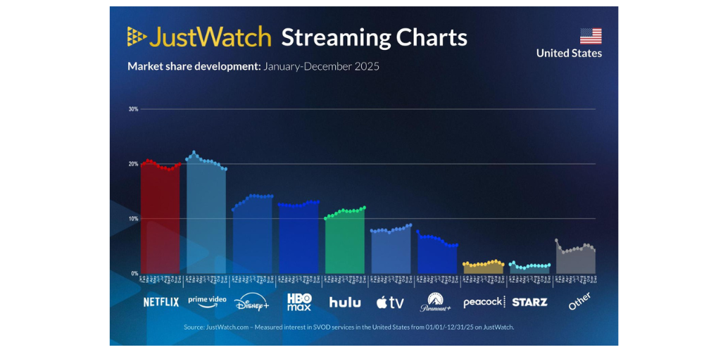 - New US market leader: Netflix (20%) overtook Prime Video (19%) in the last quarter of 2025, according to data released by JustWatch