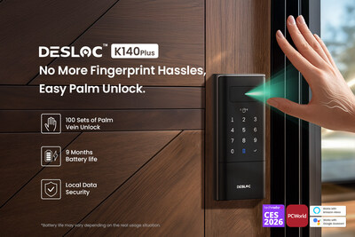 SAN FRANCISCO, March 5, 2026 /PRNewswire/ — DESLOC, a global smart lock brand under DESMAN, today announced the launch of the DESLOC Smart Lock K140 Plus, a next-generation smart deadbolt that uses advanced Palm Vein recognition technology to deliver secure, contactless access for modern households. By simply hovering a palm near the sensor, users can unlock their front door quickly and reliably—even in situations where traditional fingerprint recognition may struggle.
