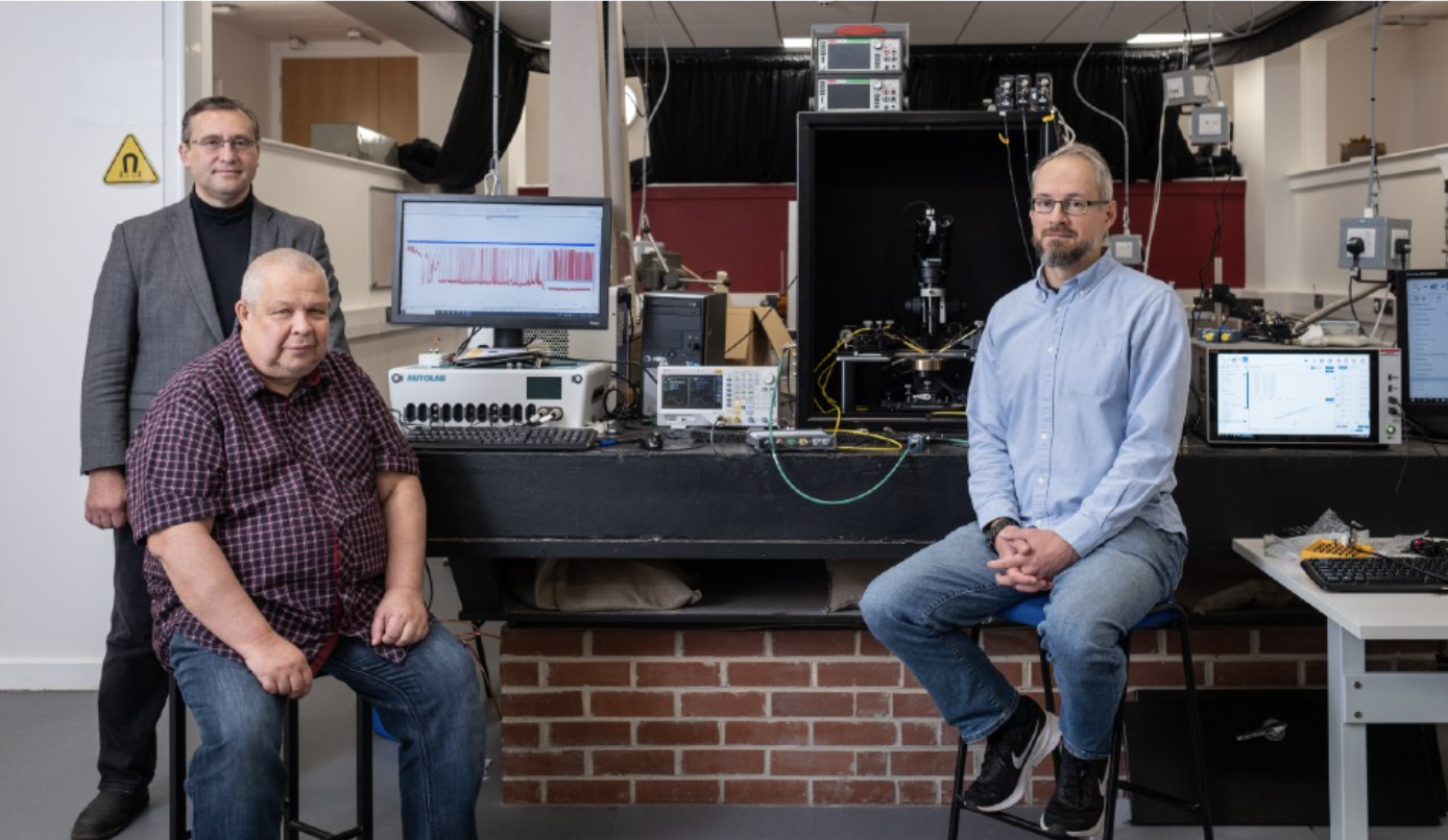 From left to right, Professor Alexander Balanov, Professor Sergey Saveliev, and Dr Pavel Borisov, of the Loughborough University Department of Physics. The team is pictured with the experimental setup used to capture how their artificial transneuron responded to electrical input, mimicking activity in different parts of the brain.